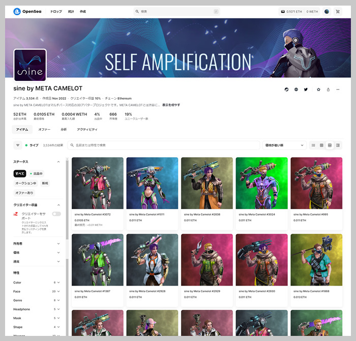 今回は、sine by META CAMELOTのNFTを購入するのが目的ですので、直接OpenSeaのコレクションページに進みましょう。以下のURLです。